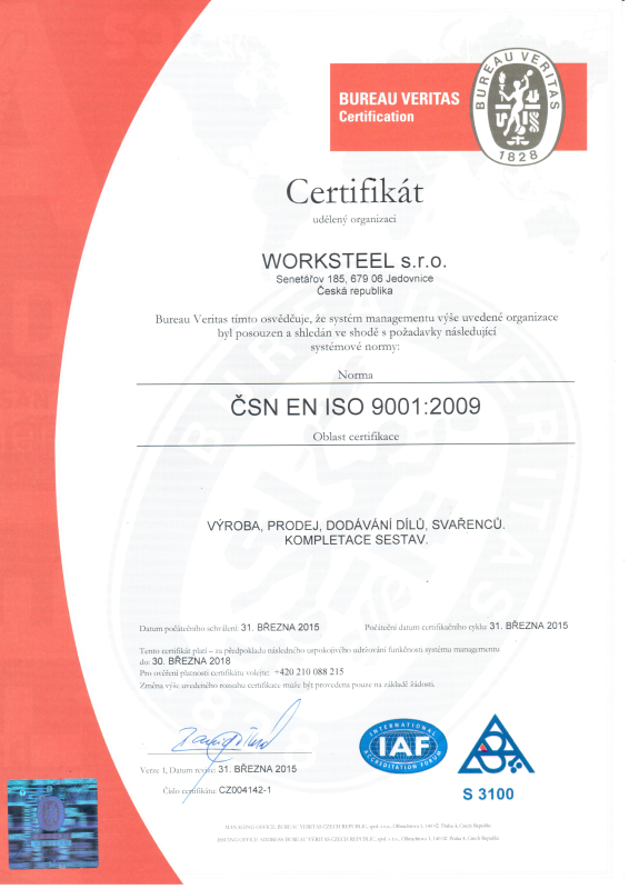 Certifikáty získané z oblasti výroba, prodej, dodávání dílů, svařenců a kompletace sestav.